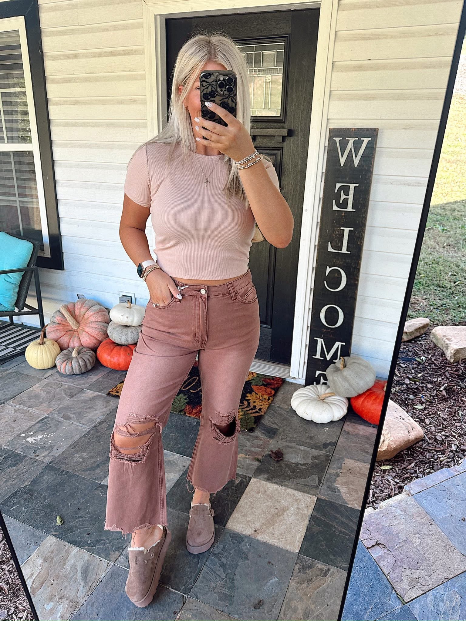 NON STRETCH DENIM, SUPER HIGH RISE WAIST, 90'S VINTAGE STYLE, DISTRESSED DETAIL, RAW HEM WITH DESTRUCTION, CROPPED LENGTH, FLARE JEANS